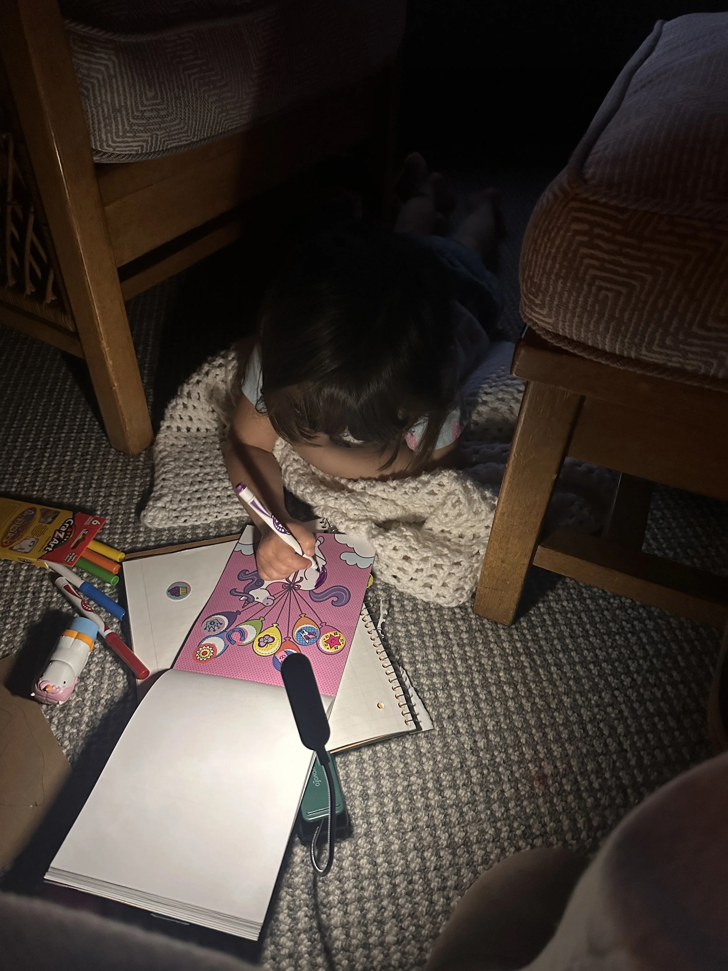 My quiet time was not exactly quiet as my little friend was up before dawn, but it was peaceful in my room. Amid the gentle glow of oil lamps, Josephine settled on the floor writing and coloring by book light. She honored the quiet hour, pretty much! This may not have been my preferred beginning to the day, but as I let go and embraced the moment, delight settled in. Then…